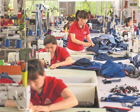 6月14日,一家户外用品公司工作人员在冲锋衣生产车间工作。