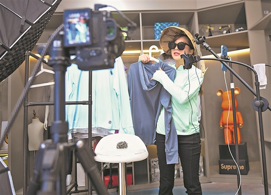 6月14日,一家户外用品公司的主播在进行线上直播。新华社记者 翁忻旸 摄