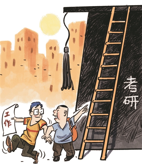 在考研还是就业的岔路口,估计不少毕业生都曾纠结:究竟是追求学历还是遵从内心?究竟是哪个学校和专业好考就考哪个,还是依据自己的潜力和能力去选择方向?自己的想法与家长不一致又该怎么办?“人往高处走”无可厚非,但对个体发展而言,考研绝非唯一出路。不同的行业和专业领域,对人才素质和能力的要求可能千差万别。对一些实践性较强的工作而言,学历或许并不是最重要的,而且,考研的竞争同样残酷,一味跟风反而可能耽误未来的就业和发展。与个体的选择相比,端正对考研的认知和态度、摈弃以学历和文凭论英雄,更为重要。