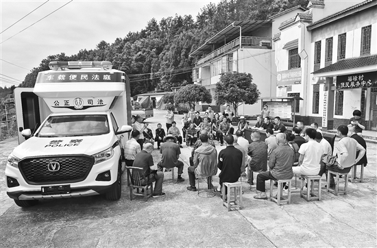 6月9日,重庆云阳县凤鸣镇福禄村,当地法院将“车载法庭”开进“天平驿站”,利用农闲时节向村民发放普法资料、讲解法律知识,并接受群众现场咨询,解决他们生产生活中遇到的各种疑难问题。这种法庭将诉讼、普法、立案、接访等六大功能“一车装”,还支持5G系统庭审直播,声像、文字同步传输,让老百姓在家门口就可以打官司。 饶国君 摄/人民视觉