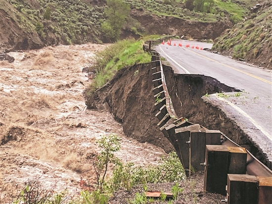 美国国家公园管理局6月13日发布的这张照片,显示了黄石国家公园北入口的洪水和受损道路。受洪水侵袭影响,黄石国家公园所有入口暂时关闭。