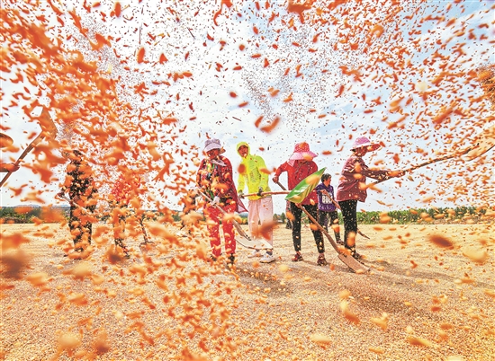 6月13日,在山东省荣成市上庄镇大李家村晾晒场,村民们在晾晒小麦。