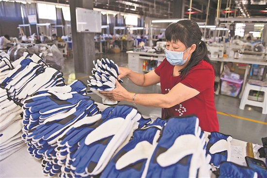 6月14日,在陕西省平利县一家社区工厂,工人在加工制作手套产品。