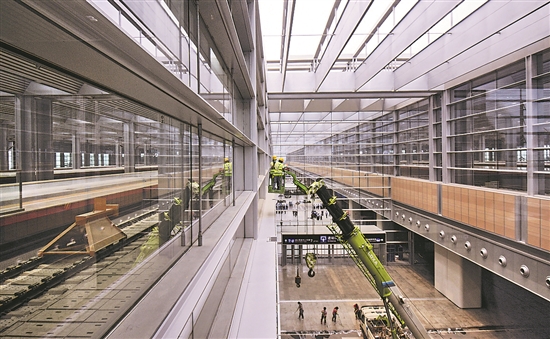 6月16日,施工人员在北京丰台站候车大厅内进行工程收尾工作。北京丰台站近日即将开通运营,这是我国首座采用高速、普速重叠的双层高架车场的大型客站,开通运营后,将承担京广高铁、京港城际、京九客专以及丰沙、京原、京沪线及市郊铁路的始发终到作业。新华社记者 李欣 摄