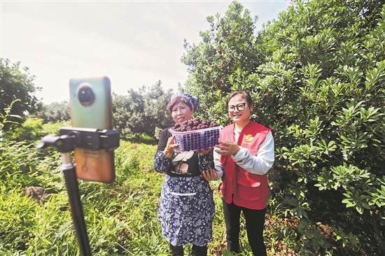 6月16日,在渚山村的杨梅种植基地,党员志愿者和种植户一起进行网上杨梅推介销售。