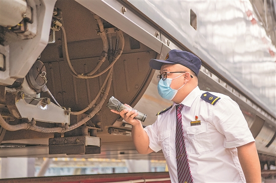 6月19日,机械师在首发列车CR400AF复兴号动车组旁进行检查作业。6月20日,郑州至重庆高速铁路襄阳东至万州北段将建成开通,我国西南地区外出的又一快速客运通道——郑渝高铁实现全线贯通运营。新华社记者 唐奕 摄