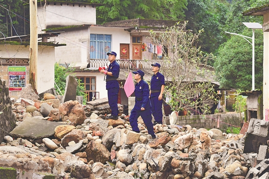 6月20日,在融水苗族自治县香粉乡新平村,乡专职消防救援队队长林晴(中)和队友在巡逻。