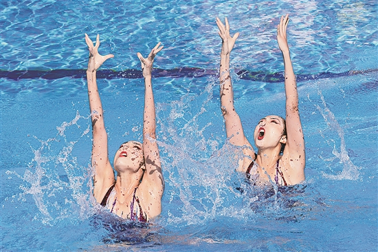 6月19日,王柳懿/王芊懿在花样游泳女子双人技术自选决赛中获得金牌。新华社发(弗尔季·奥蒂洛 摄)