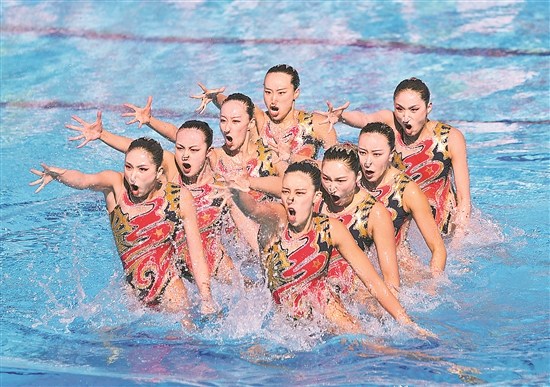 6月21日,中国队在花样游泳集体技术自选决赛中获得冠军。 新华社记者 李颖 摄