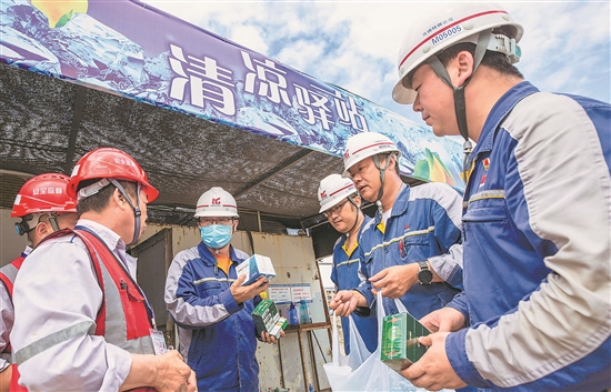 6月21日,位于安徽省马鞍山市的中国宝武马钢特钢公司新特钢项目建设工地上,职工代表正在检查防暑降温药品的发放。