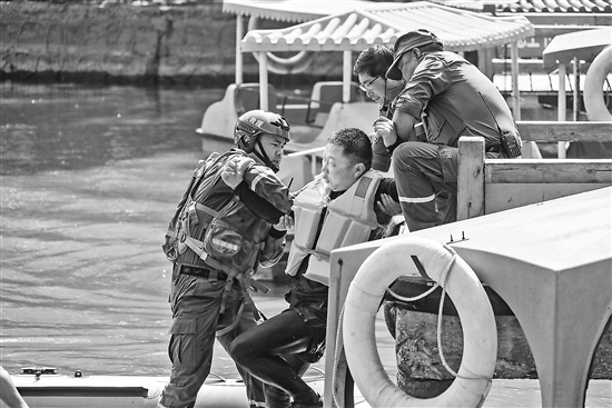 6月21日,江苏淮安,救援人员将“落水”游客转至上岸。当日,楚秀园举行水上救生应急演练,演练中救援人员将不慎落水游客安全救助上岸,并进行施救,旨在增强公园工作人员安全生产意识,提高水面应急救援能力,确保公共场所游客安全。赵启瑞 摄/人民视觉
