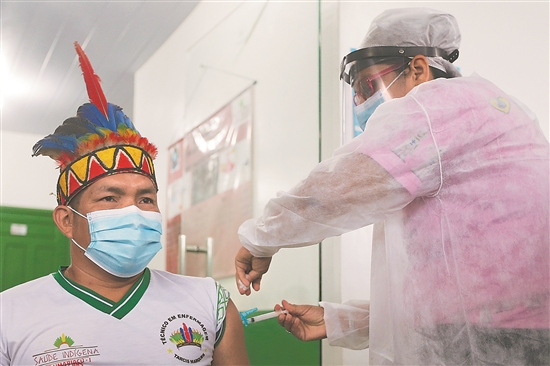 ② 2021年1月19日,医护人员在巴西亚马孙州塔巴廷加市为一名原住民接种中国新冠疫苗。新华社发(卢西奥·塔沃拉 摄)