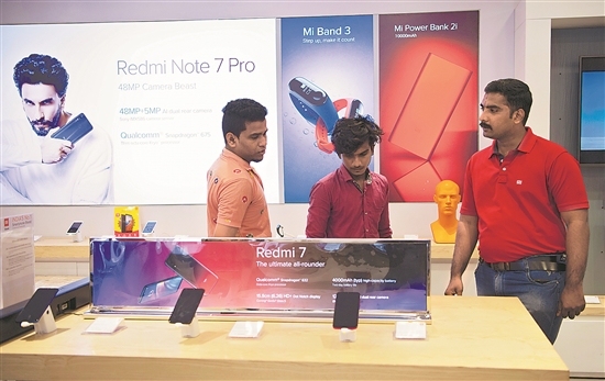 ③ 2019年10月8日,人们在印度金奈一家商场的中国品牌小米门店购买手机。新华社记者 吕小炜 摄
