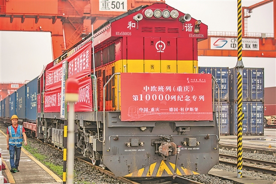 当日,第10000列中欧班列(重庆)满载着100个标箱的电子产品、机械零件、日用百货等货物,从重庆团结村中心站顺利驶出,一路向西,奔赴一万余公里外的德国杜伊斯堡。重庆成为全国首个累计重箱折列开行量突破 10000 列的中欧班列开行城市。