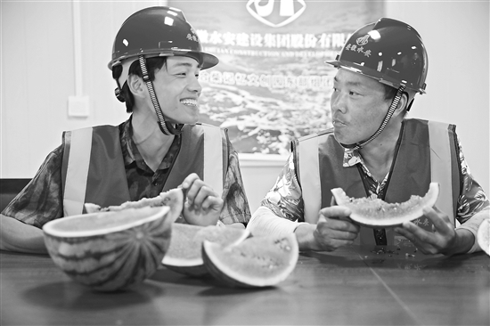 6月17日上午,在安徽省合肥市合柴记忆文创园东部组团项目工地,95后钢筋工小张(左)为父亲送上自己亲手切的西瓜,表达节日祝福。