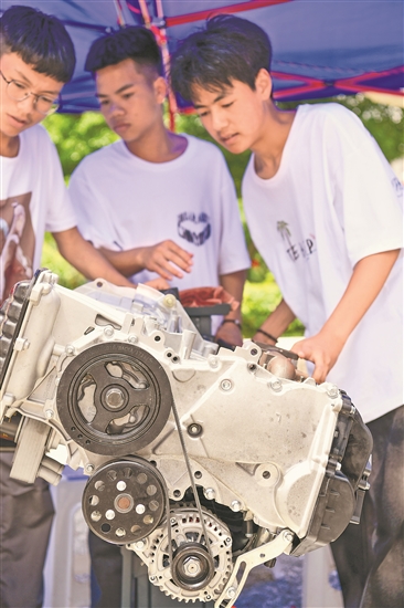 6月26日,贵州省龙里县中等职业学校的学生在进行汽车零部件维修技能展示。