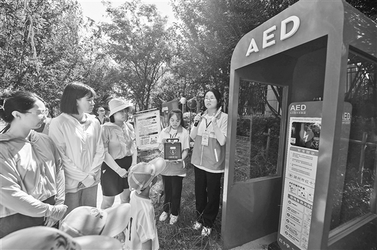 6月27日,龙泉街道红十字会志愿者为辖区居民们介绍自动体外除颤器(AED)的使用知识。随着夏季汛期和暑期开始,浙江省湖州市吴兴区龙泉街道应急管理中心组织红十字会志愿者、应急管理人员等在各社区和学校开展暑期安全教育,包括急救知识、防溺水知识、防火防漏电知识等。
