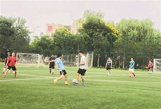 随着疫情防控形势趋稳,近期北京体育健身场所陆续开放。图为北京市民在昌平区体育文化公园内进行足球比赛。