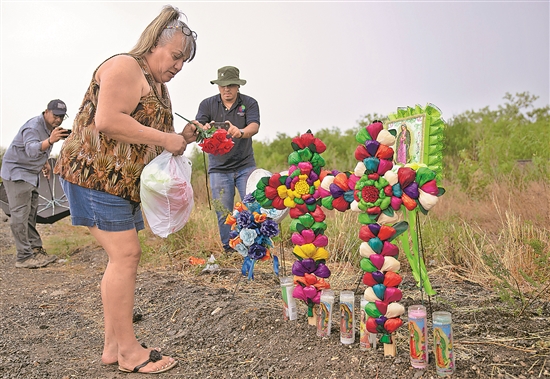 6月28日,一名女子在美国得克萨斯州圣安东尼奥市货车惨案现场摆放塑料花束。