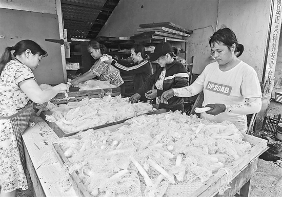 图为江西省抚州市资溪县高阜镇莒州村务工妇女在菌类种植基地整理竹荪。