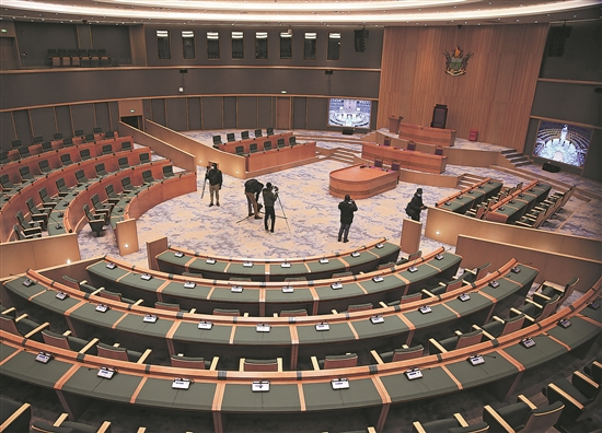 中国在南部非洲的最大援建项目津巴布韦新议会大厦6月29日举行媒体开放日,施工方宣布项目已竣工并通过验收。新议会大厦总建筑面积3.3万平方米。图为位于津巴布韦汉普登山新城的新议会大厦内的参议院议事厅(6月29日摄)。新华社发(肖恩·朱萨 摄)