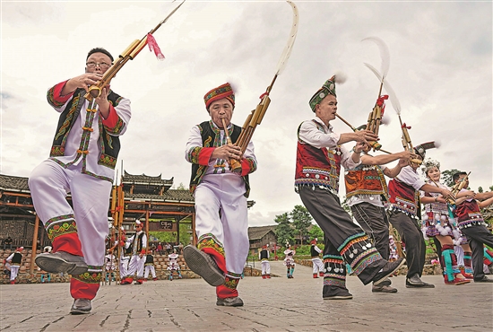 7月2日,在广西柳州市融水苗族自治县,苗族群众吹奏芦笙。当日,广西融水易地扶贫搬迁铁坑安置点的苗族同胞迎来传统“新禾节”,搬出大山的人们载歌载舞欢度节日。“新禾节”是苗家预祝丰收的传统节日,通常在农历六月稻禾将要抽穗期间举行。龙涛 摄/人民图片