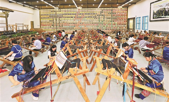 7月4日,在湖南张家界武陵源区乖幺妹土家族织锦基地“妈妈工坊”,妈妈们在制作织锦产品。近年来,武陵源区依托当地的乖幺妹土家族织锦基地建立“妈妈工坊”,让当地妇女在陪伴、照顾家人之余学习传统的土家族织锦技艺,实现家门口就业。