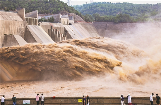 7月4日,游客观看黄河小浪底水库排沙出库。