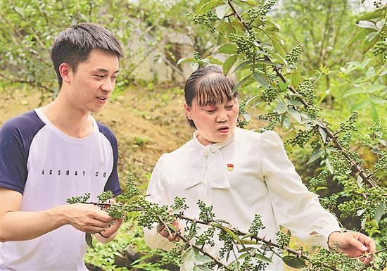 近年来,贵州桐梓县聚焦“党建链”服务“产业链”,支部引领,合作社参与,村民联动抱团发展,完善村级产业链,大力发展特色产业,带动群众增收致富。图为桐梓县坡渡镇坡渡社区党支部书记在讲授花椒管护要求及采摘技巧。