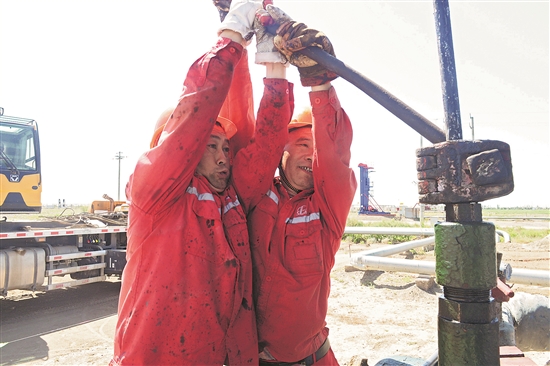 6月25日,新疆春风油田排601井场,地面气温38摄氏度。新春公司采油管理一区巡井工郭正坤(左)和李念书是在一个单位工作30多年的老工友,最近他们分到一个班组成了搭档,两人在生活上互相关心,工作中互相提醒安全,干起活来一条心一股劲儿,让孤寂的戈壁岁月变得舒心且快乐。秦柯 摄