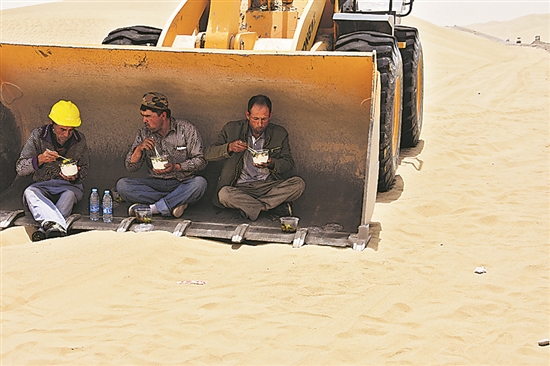 6月30日正式通车的尉且沙漠公路,是第3条穿越“死亡之海”塔克拉玛干沙漠的公路,也是无数筑路人踏出的一条“不凡之路”。酷热的沙漠里,推土机的铲斗里是修路工午餐时难得的阴凉地儿。张良杰 摄