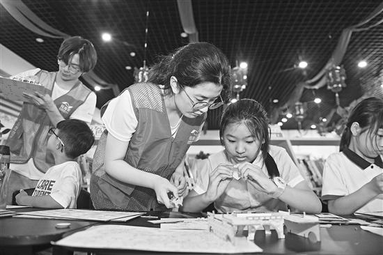 7月4日,小学生在青年志愿者的指导下搭建建筑模型。当日,由浙江省慈溪市钱海军志愿服务中心和宁波大学科学技术学院的大学生志愿者共同举办的“星星点灯”暑期公益夏令营开课。新华社记者 徐昱 摄
