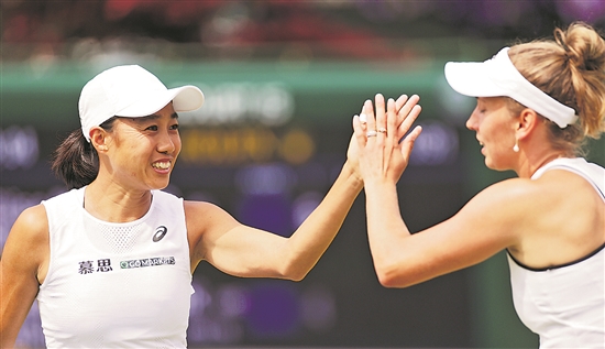 7月4日,张帅(左)/梅尔滕斯在比赛中庆祝得分。当日,在英国伦敦举行的2022温布尔登网球公开赛女子双打第三轮比赛中,张帅(中国)/梅尔滕斯(比利时)组合以2比0战胜基切洛克(乌克兰)/奥拉鲁(罗马尼亚)组合,晋级八强。张帅就此实现四大满贯女双都至少打进八强的战绩。