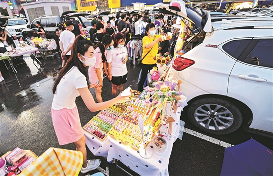 32岁的蔡鑫是沈阳市和平区一家大型洗浴中心的美甲师,疫情防控期沈阳娱乐场所歇业,她连续两个月没有收入,每个月5000元的租金还要按时交。日常出行时,她看到多个停车场里有“后备箱集市”,便申请了。“充电灯照明,甲片展板、美甲工具一摆就可以做生意。”蔡鑫说。
