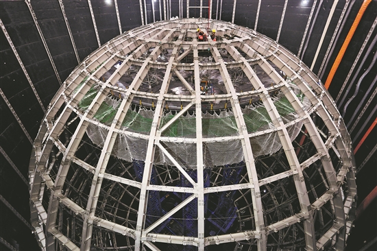 6月23日,江门中微子实验(JUNO)地下700米的实验大厅内,工程人员顺利完成试验装置主结构球形网壳的拼接。该装置计划于明年建成运行,将使我国成为国际中微子研究的中心之一。黄继明 摄