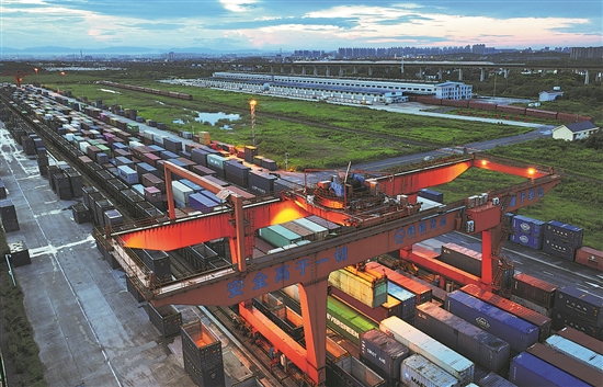 7月7日,在江西南昌国际陆港,龙门吊正在进行装卸作业。融入“一带一路”建设后,目前该港铁海联运集装箱到发量已居江西省第一。