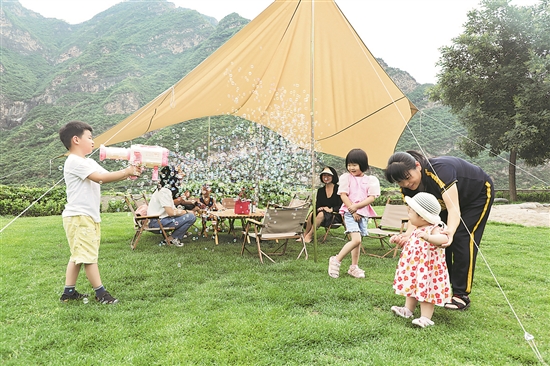 图为近日,游客在河北省保定市涞水县野三坡景区露营基地休闲玩耍。新华社记者 高博 摄