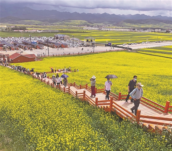 依托油菜产业的花海旅游,让很多农牧民吃到“旅游饭”。7月初刚刚通车的张汶高速门源段,使门源的交通变得更为便捷。依托独特的花海资源,门源县开展了“青海人游门源,周边人游门源,门源人游门源”活动,还开拓“周末微旅游”等方式,打造“西宁后花园”,以及全省“国际生态旅游目的地的北部高地”。