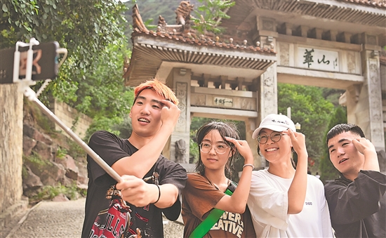 7月9日,几位来自西安和天津的大学生在华山步行道口留影。据统计,6月份华山景区累计接待游客量增至28.9万人,经营收入大幅提高,同时带动周边餐饮、住宿、交通等关联消费的快速增长。