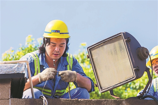 7月6日,气温高达38.5摄氏度,浙江省宁波舟山港北仑矿石码头分公司机修分部修理二班电工罗佳琦与同事们头顶烈日检修路灯,汗如雨下。近一个月来,该班组开展夏季电气专项维护工作,确保电气设备“零缺陷”投运,保障港区用电安全。蒋晓东 摄