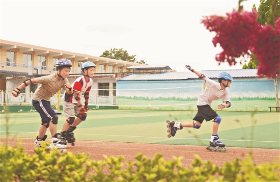 7月12日,在河北省邢台市南康庄小学,参加暑期活动的孩子们练习轮滑。
