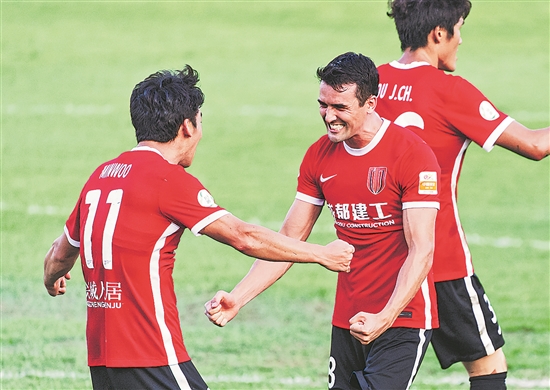 成都蓉城队球员周定洋(中)与队友金敃友(左)在比赛后庆祝。新华社记者 王冠森 摄