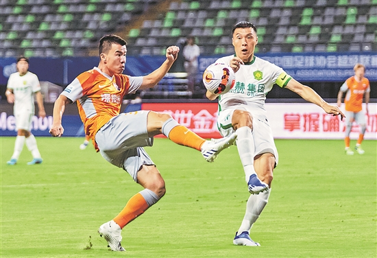 深圳队球员孙可(左)与北京国安队球员于大宝在比赛中争抢。新华社记者 王冠森 摄