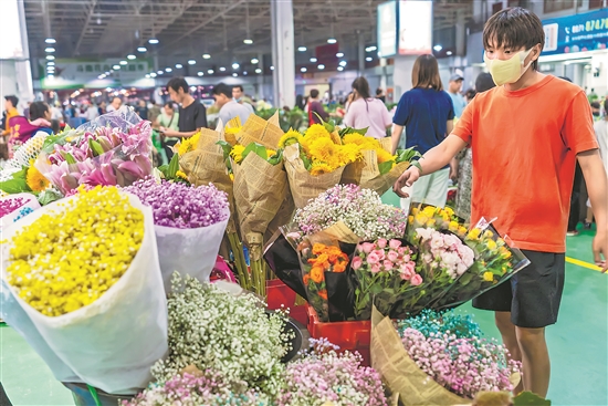 7月12日晚,游客在昆明斗南花卉交易市场内挑选鲜花。