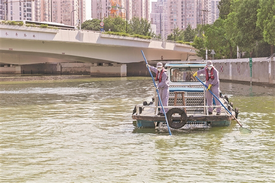 7月13日,河道保洁员在苏州河长寿路桥段打捞水面的漂浮垃圾。
