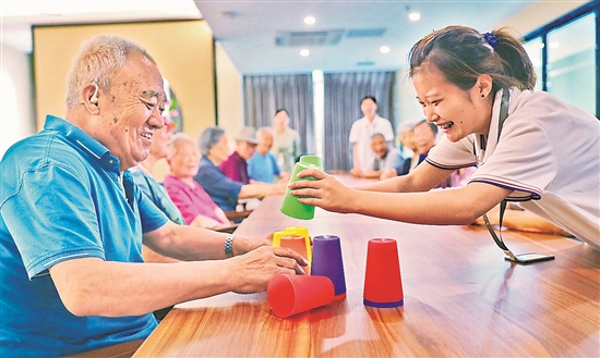 7月13日,位于河北省秦皇岛市海港区海阳镇的秦皇燕达金色年华健康养护中心内,工作人员带领老人体验趣味游戏。