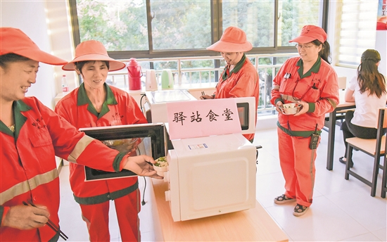 7月14日中午,位于安徽省合肥市祁门路与呈坎路交口的望湖城“工会幸福驿站”内,几名环卫工人在享受工会志愿者为他们提供的包括绿豆汤、手持小风扇等在内的“夏季避暑套餐”。