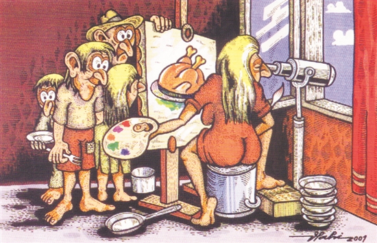 家境窘迫的主妇操持着人们的吃用,她在断炊的日子里发挥特长,用画笔代替锅、碗、瓢、盆,从邻家“借”来免费的午餐。