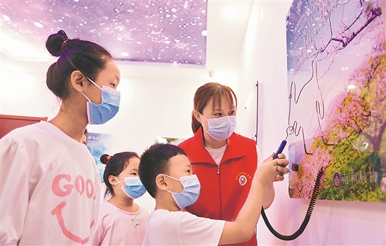 7月17日,在河北省邢台市南和区和阳镇和韵社区人文公共空间,文明实践志愿者为孩子们讲解科普知识。