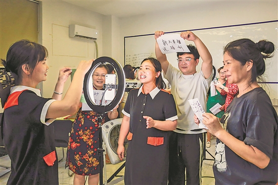 7月15日,在江西省新余市总工会主办的数字技能培训班上,学员正在老师的指导下进行直播实操练习。